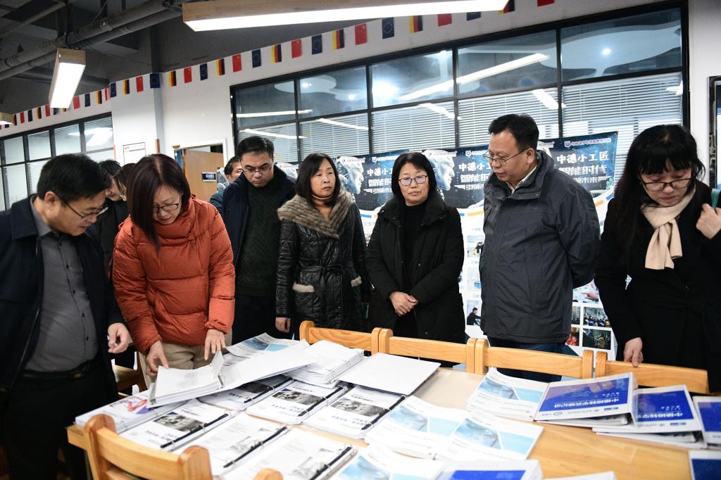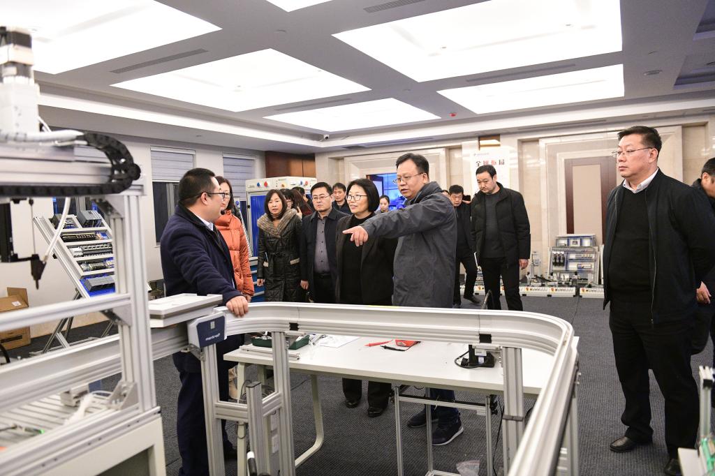 杨百梅一行实地观摩了中德智能制造产教融合示范基地项目建设情况,并详细考察了智能制造教育实训装备研发制造过程、德国“双元制”人才培养体系本土化实施、国际化技术实训中心建设等情况。崔智详细介绍了公司集聚世界龙头企业、行会和科研机构、学校与教育机构的“三位一体”中欧合作模式,以及公司在人才培养、技术研发、智能制造等方面为中国高校和企业提供国际优质教育资源与先进技术的全产业链服务体系。