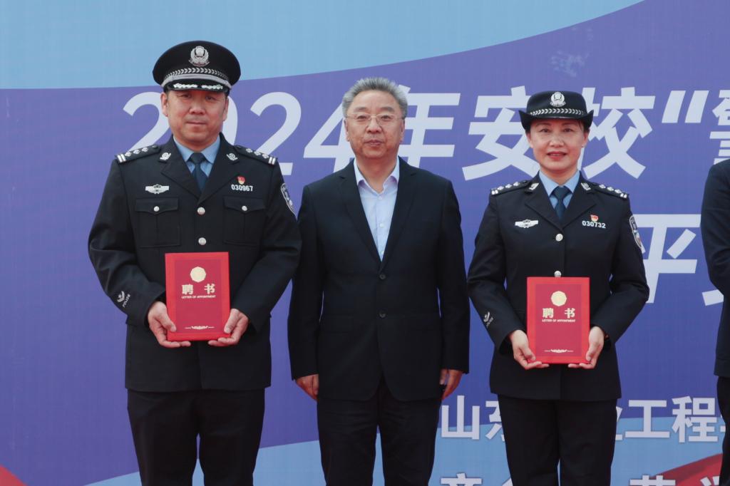 仪式上,淄博市公安局周村分局表彰了我院2023年度20名优秀安校“警+”卫士和100名优秀学生平安志愿者,并公布了2024年度新聘任安校“警+”卫士名单。毕思勇代表学院宣读了《关于聘任2024年法治副校长的决定》,聘任淄博市公安局周村分局北郊派出所杜平、李琳为我院法治副校长,明确了法治副校长的聘期与主要职责。工商管理学院学生工作负责人薛健作为优秀安校“警+”卫士代表、建工学院同学王显傲作为优秀平安志愿者代表分别进行发言,与会平安志愿者还在现场作出了庄严宣誓。