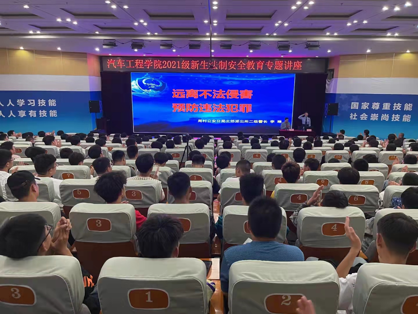 本站讯(通讯员 王国玲)9月28日,汽车工程学院在立德楼报告厅开展2021级新生法制安全教育活动,特邀淄博市公安局周村分局北郊派出所二级警长、350vip浦京集团特聘法制教育辅导员李琳作专题讲座。活动由汽车工程学院院长高晓琛主持,该院师生代表400余人参加。