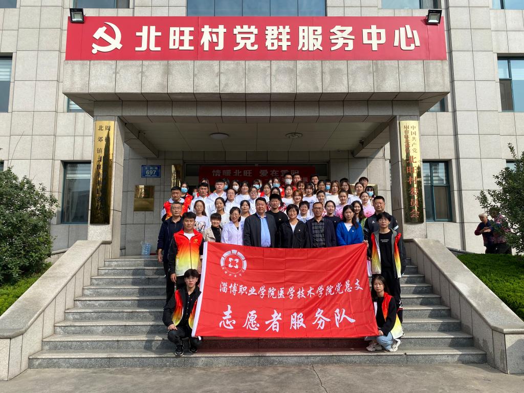 志愿者服务队60余人走进周村区北旺村,为村民表演节目。节目以“我爱我的祖国”健美操表演开场,学生们的青春活力感染了老人,还进行了歌舞朗诵、武术表演,给老人增添一份节日的幸福与欢乐。随后,党总支党员发挥专业优势,利用专业技能为老人义诊。学生预备党员和入党积极分子参观了“马耀南故居”,清理卫生,学习英雄故事。