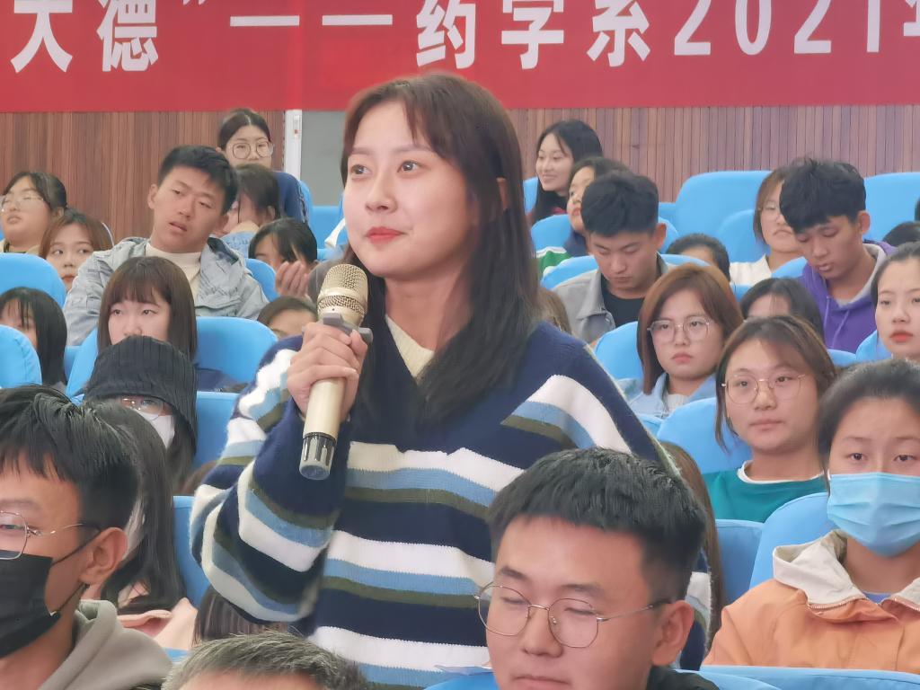 14:00,一首洋溢着青春活力的歌曲《最初的梦想》拉开了药学系2021年道德讲堂的序幕。该系2021年道德讲堂以“汇细流成江河,积小善成大德”为主题,活动分为唱歌曲、学模范、立榜样、发善心、诵经典、向“德”字鞠躬六个环节。活动中,教师宣讲员讲述了平凡抗疫英雄的不平凡故事,饱含深情的讲述让在场师生深受感动;学生宣讲员则分享了该系2017级优秀毕业生的故事,引导大家从身边小事做起,从一言一行做起,不断提升自身道德修养。