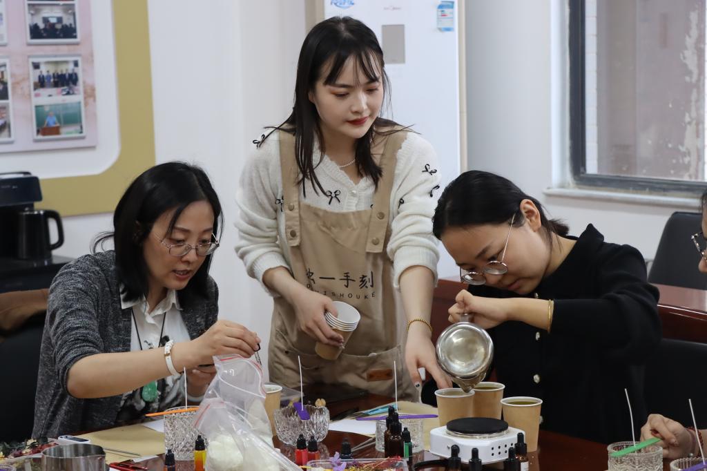 本次活动邀请专业香薰蜡烛制作老师前来指导,介绍了熏香的起源,带领大家感受了香道的历史和文化魅力。老师们亲自参与到融蜡、装杯、滴精油、插烛芯、装饰点缀的每一个环节,体验动手的乐趣,最后大家展示了自己的作品并交流分享工作生活中的感悟经验,发出“三提三争 巾帼先行”的倡议。