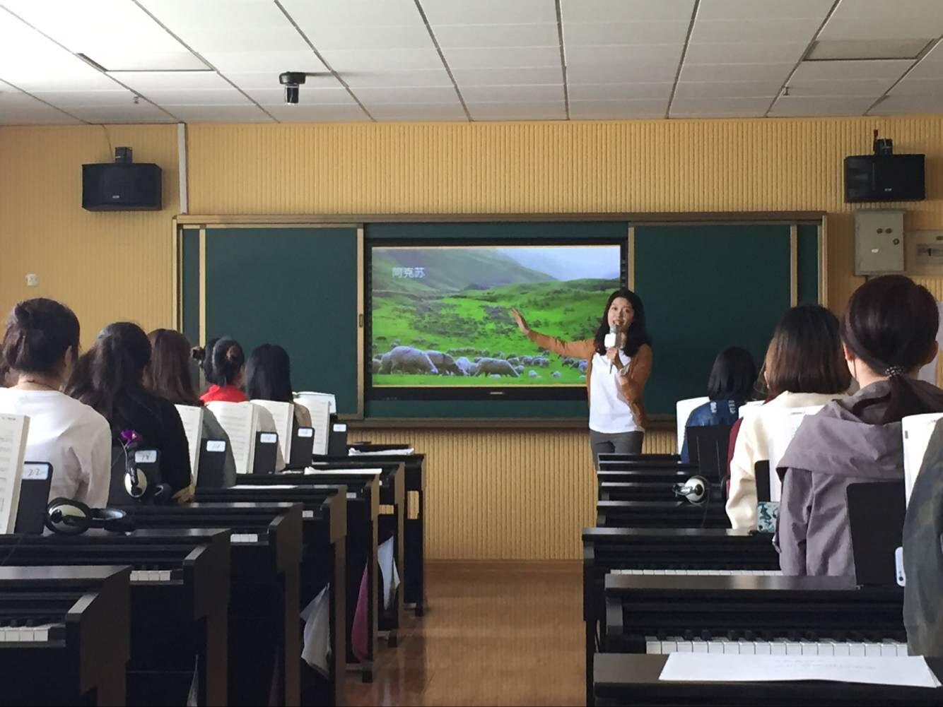 课上,张美杰为大家呈现了一堂内容丰富的《牧童之歌》儿歌弹唱课,运用了图片展示、音乐欣赏、教师示范、学生展示等多种教学方式,为学生创设了生动形象的教学情境,学生们积极参与、认真听讲、主动交流,师生互动良好,课堂气氛活跃,该课配合现代化的电钢教室、先进的多功能音响及全触摸屏幕,取得了良好的教学效果。