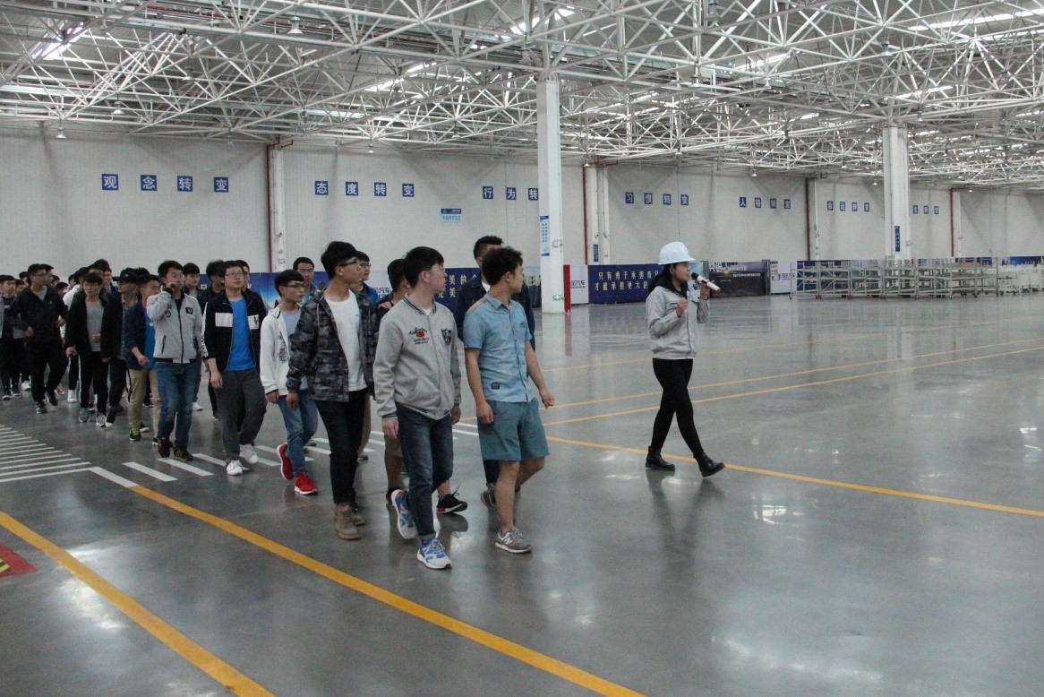 同学们在企业工作人员的带领下,认真参观了冲压、焊接、总装三个车间,公司人力资源部向经理给同学们介绍了公司的发展情况、工作岗位、工资待遇、成长路径等学生关心的问题,学生对山东国金新能源汽车制造有限公司有了较为深入的了解。