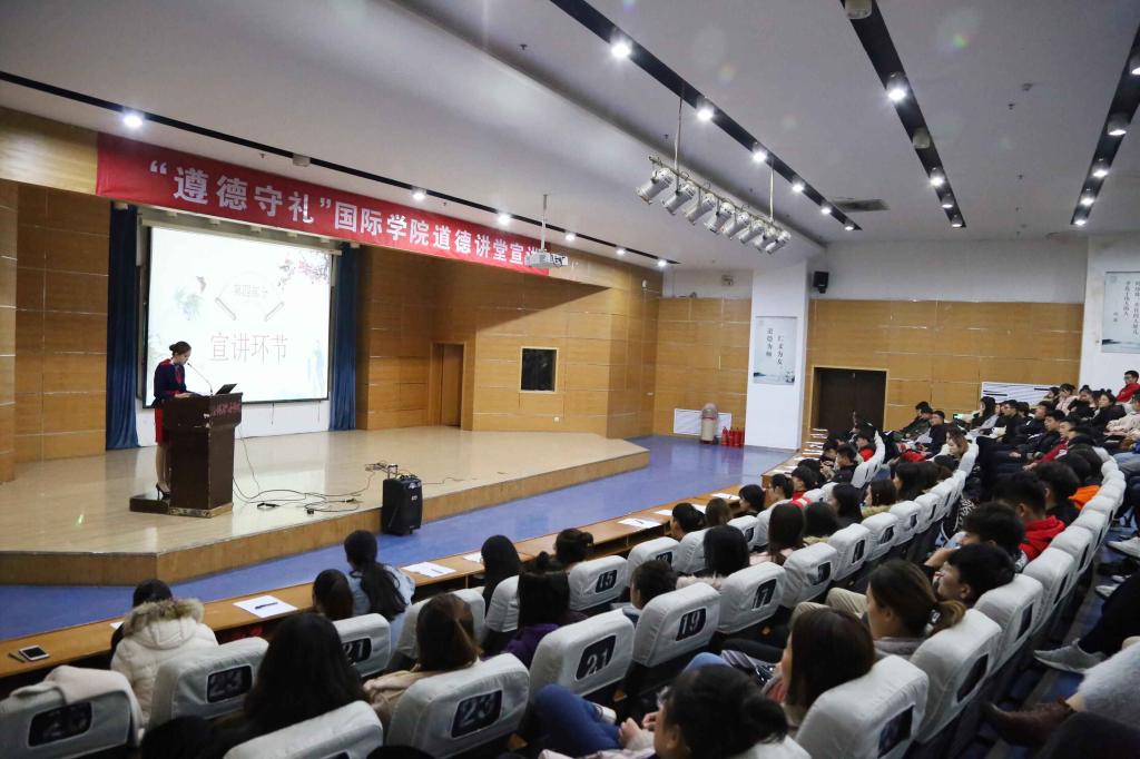 本站讯(通讯员 张迁迁)11月13日下午,国际学院在南校区尚德楼报告厅举办了主题为“遵德守礼”的道德讲堂活动,该院全体在校生和教师代表300余人参加。