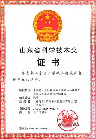 山东新华制药股份有限公司与青岛科技大学、山东科技大学联合研究与实践应用的《原料药生产过程中多元共沸物的连续化热集成分离与精密控制技术》成果被山东省人民政府授予“2019年度山东省技术发明奖二等奖”。